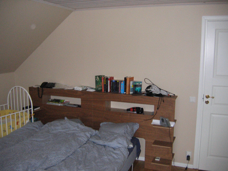 Till vårt sovrum köpte vi en sängpanel i oljad valnötsfanér. Runt sängbottnarna ska vi sätta en enkel diskret sängkappa så man slipper se dem och de fula sängbenen.